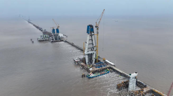 昨天上午,通苏嘉甬高铁慈溪段杭州湾跨海大桥施工现场,打桩船、起重机往来交错,正狠抓中海中引桥栈桥与主墩施工。与此同时,大桥控制性工程南航道桥主塔施工有序推进,南北两座主塔已分别施工至第22节、14节,预计6月底前实现封顶。建设者们正以“开局即决战、起步即冲刺”的奋斗姿态,抢抓一季度“开门红”,为这座世界级跨海铁路桥的早日建成通车奠定坚实基础。